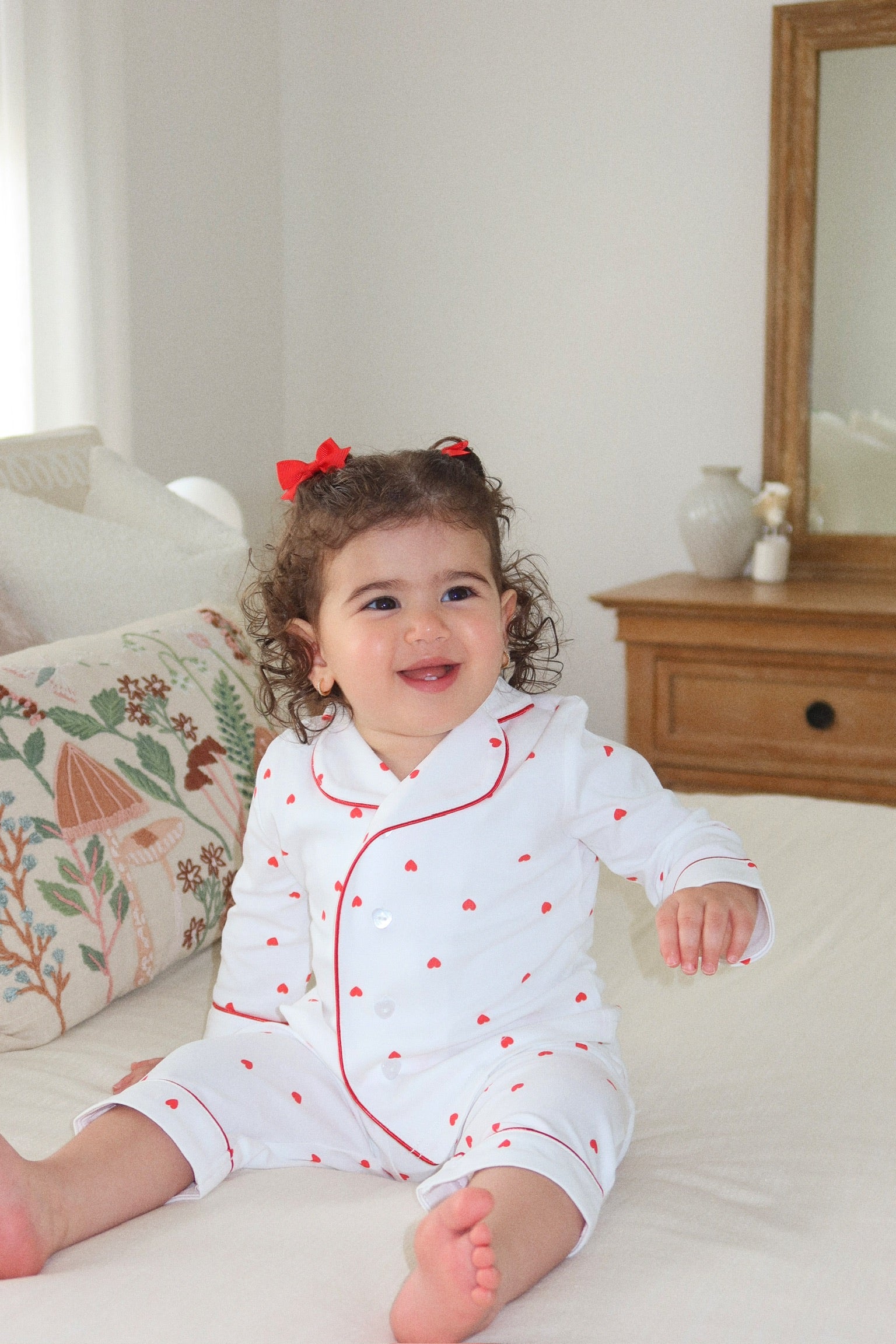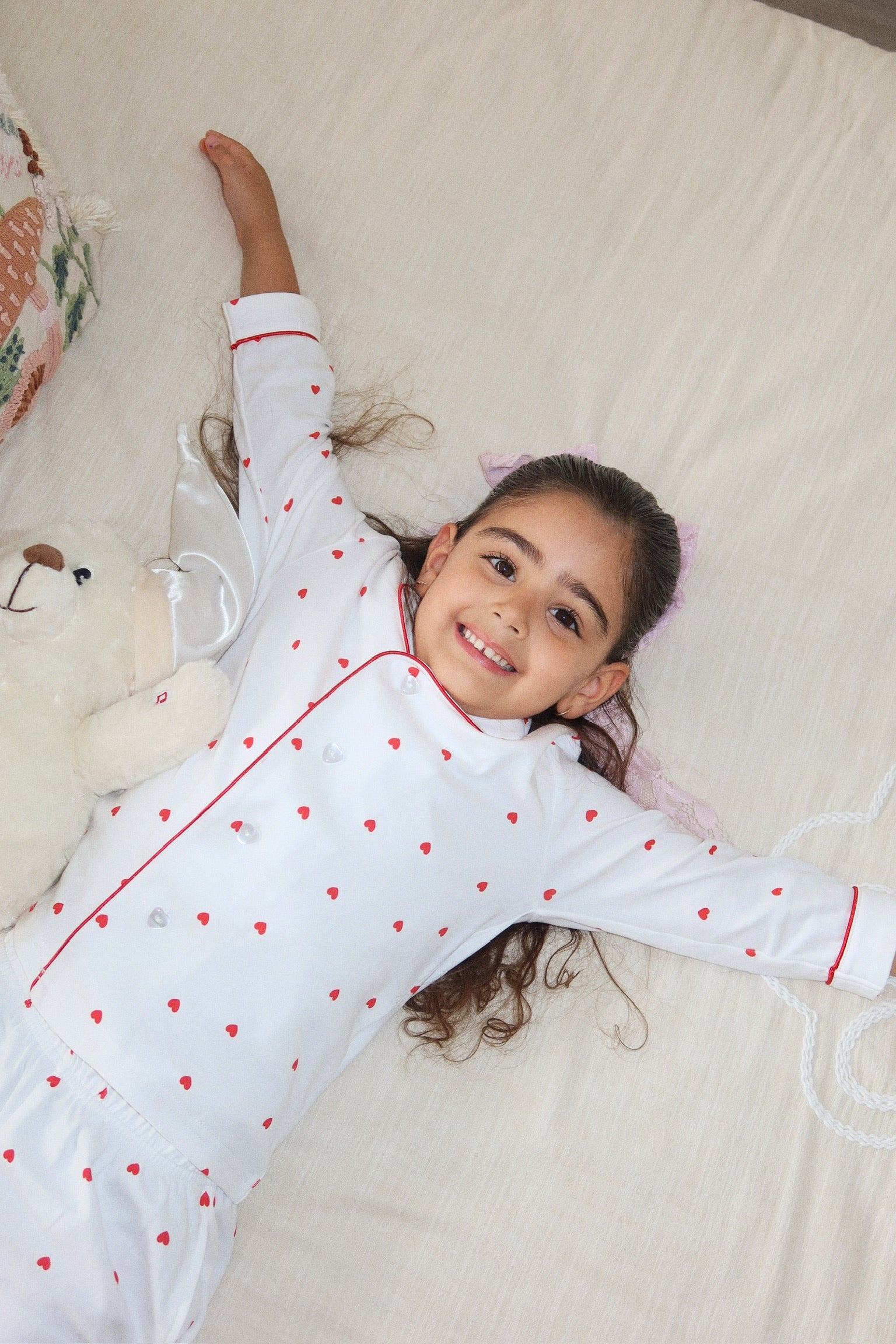 A soft and breathable 100% cotton pyjama set featuring and a cute heart print, red piping details, and a cozy button-up with matching pants. Perfect for bedtime and all day wear.